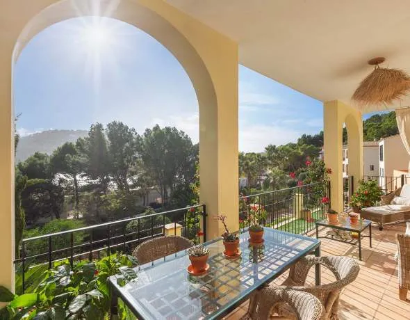 Este apartamento de estilo mediterráneo está en la planta baja de un complejo comunitario con piscina, en una codiciada zona residencial de villas y apartamentos situada en la parte sur del pintoresco puerto natural. El puerto deportivo «Club de Vela» se encuentra a solo unos minutos a pie, al igual que el popular paseo marítimo, con tiendas y restaurantes. Las montañas circundantes y las cristalinas aguas del Mediterráneo ofrecen numerosas posibilidades para realizar actividades de ocio, como senderismo, vela y deportes acuáticos. El mar y la popular playa de Cala Fonoll están a solo unos pasos.