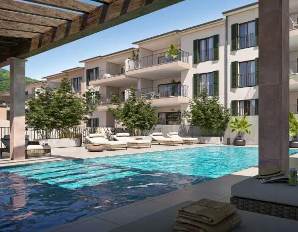 De estilo moderno pero mallorquín, se construirán 23 pisos de obra nueva y nueve casas adosadas en las afueras del pueblo. El complejo dispondrá de piscina y jardín comunitarios y de numerosas plazas de aparcamiento para todos.