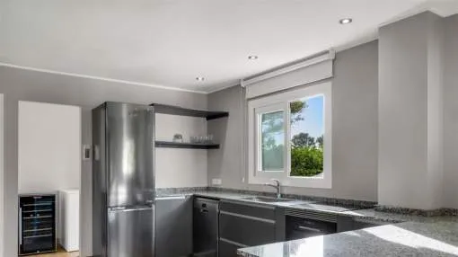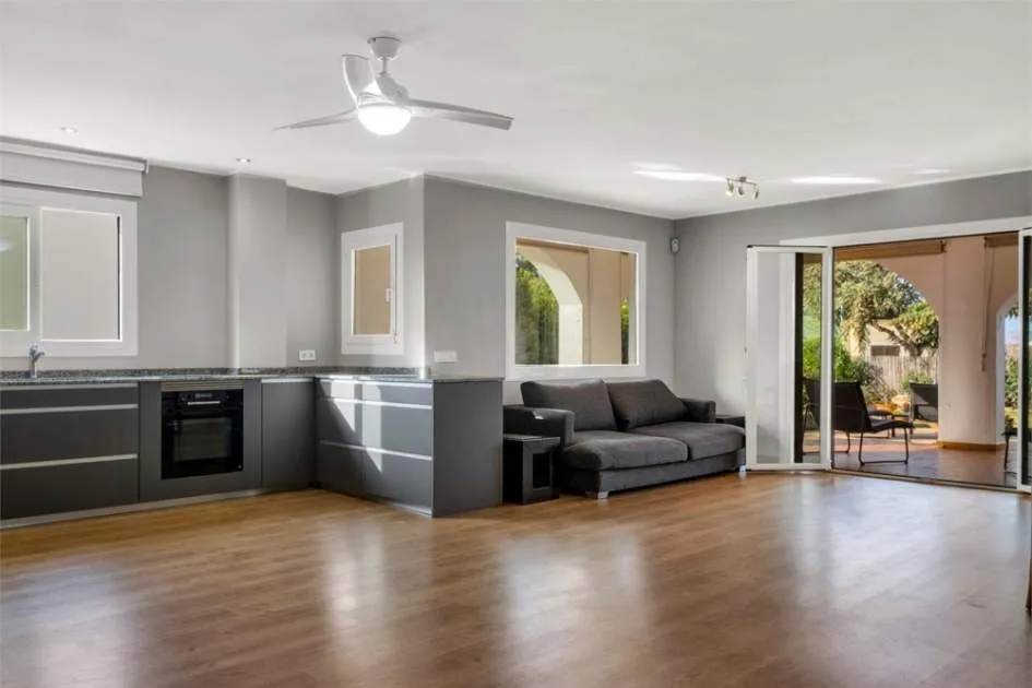 La vivienda cuenta con un salón-comedor amplio con cocina americana amueblada, muy luminosa y funcional, con salida directa a un porche y un gran jardín privado, ideal para disfrutar del clima mediterráneo durante todo el año.