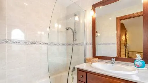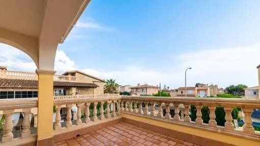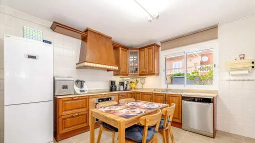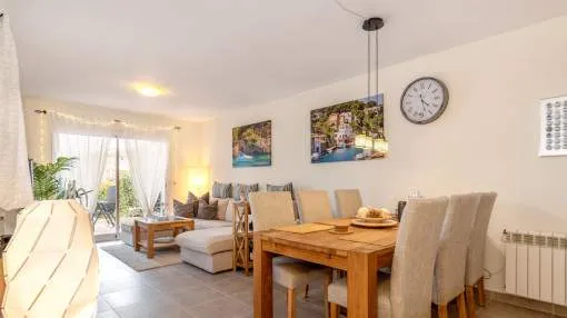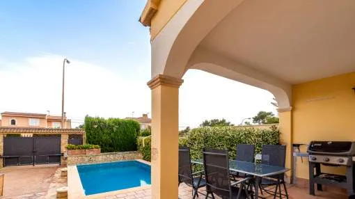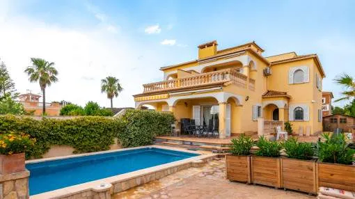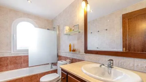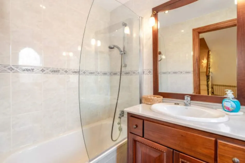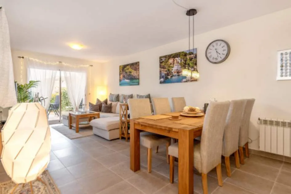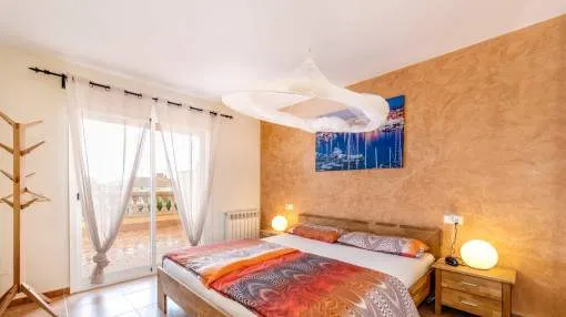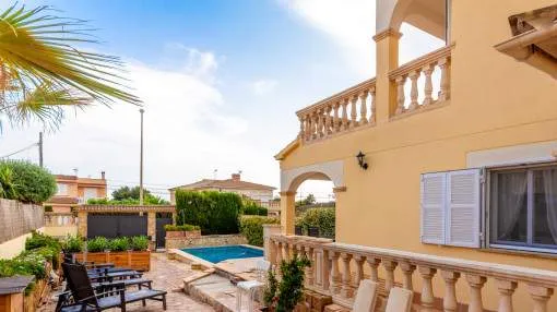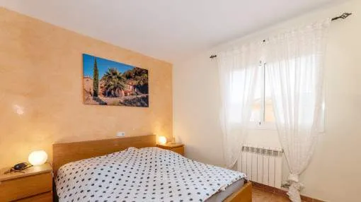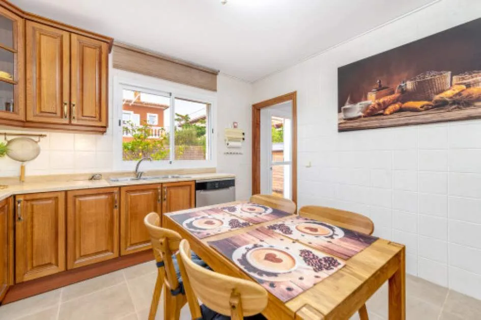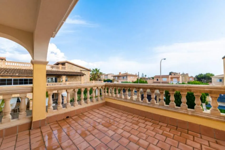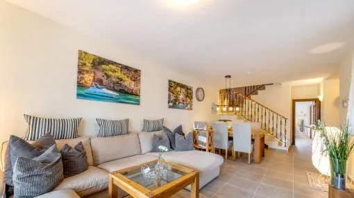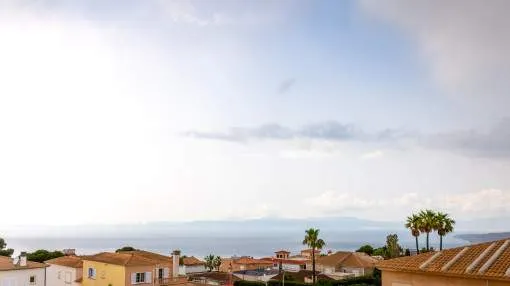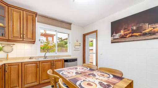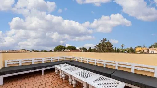 Descripción del inmueble: Casa adosada muy bonita y bien mantenida con piscina en la población costera de Bahía Azul. En un total de 186 m2 distribuidos en 2 plantas, hay 3 dormitorios y 3 baños, uno de ellos en suite. Al entrar en la casa, se accede a través del vestuario a la zona de estar de estilo abierto con salida a la terraza, a la cocina independiente o a un dormitorio con baño asociado. En la planta superior se encuentra el dormitorio principal con baño en suite y un gran balcón, así como otro dormitorio con baño independiente. También hay una terraza en la azotea con vistas al mar sobre toda la bahía de Palma hasta la Sierra de Tramuntana. Otras características incluyen aire acondicionado en los dormitorios, calefacción central y una piscina de 21 m2 que funciona con cloro. Actualmente se están reformando los jardines y abriendo la terraza. Una perfecta casa de vacaciones de bajo mantenimiento en una buena ubicación. Está a 5 minutos de la playa de arena más cercana, a 10 minutos del aeropuerto y a unos 20 minutos en coche de Palma. Lugar & alrededores: Bahía Azul está situada en el extremo oriental de la bahía de Palma. Se trata de una zona residencial tranquila que consiste principalmente de villas. Se halla encima del acantilado, dispone de buena infraestructura, y en unos de 15 minutos se llega al aeropuerto y la ciudad de Palma.