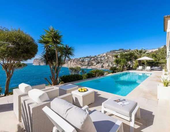 Esta excepcional propiedad de lujo impresiona por sus líneas arquitectónicas elegantes y atemporales, y se encuentra en Cala Llamp, una de las zonas residenciales de villas más codiciadas del exclusivo Puerto de Andratx, junto al mar y con fantásticas vistas panorámicas del impresionante paisaje costero.