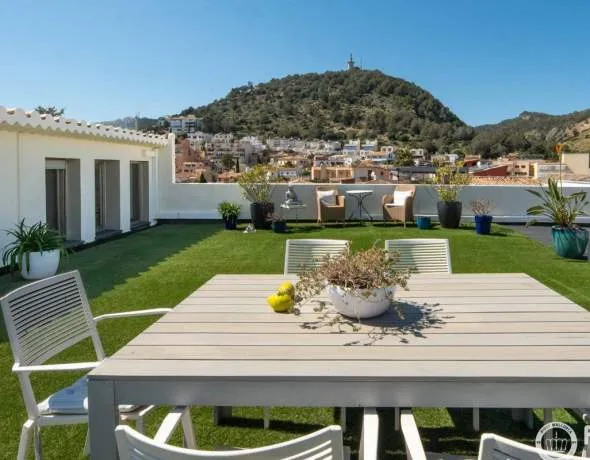 La planta superior alberga un segundo dormitorio en suite con acceso directo a una impresionante terraza de 150 m². Desde aquí se despliegan impresionantes vistas panorámicas de 360°, incluyendo vistas parciales al mar, ofreciendo una experiencia exterior verdaderamente única. La propiedad también cuenta con una licencia vacacional válida, lo que la convierte en una excelente oportunidad tanto como residencia privada como inversión con gran potencial de alquiler.