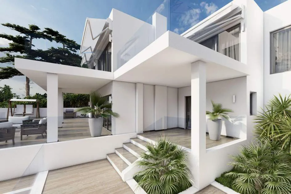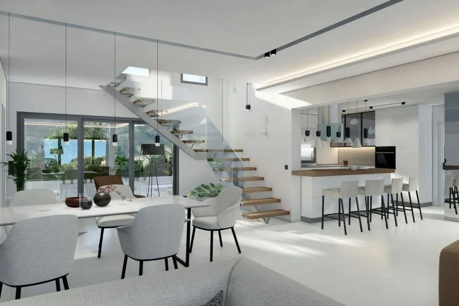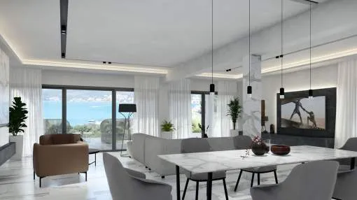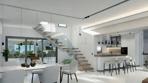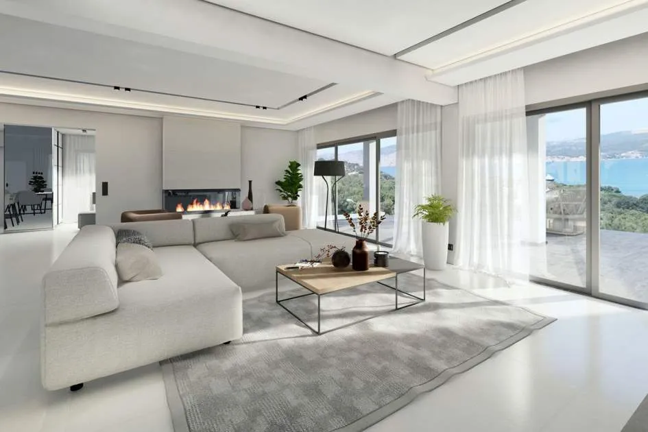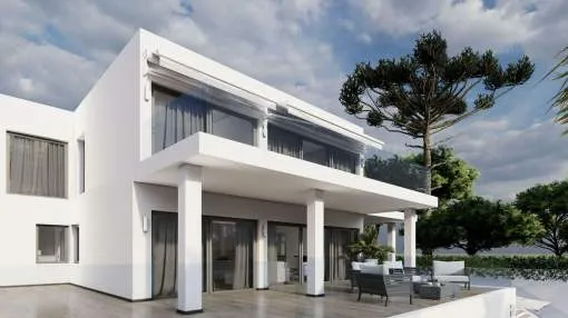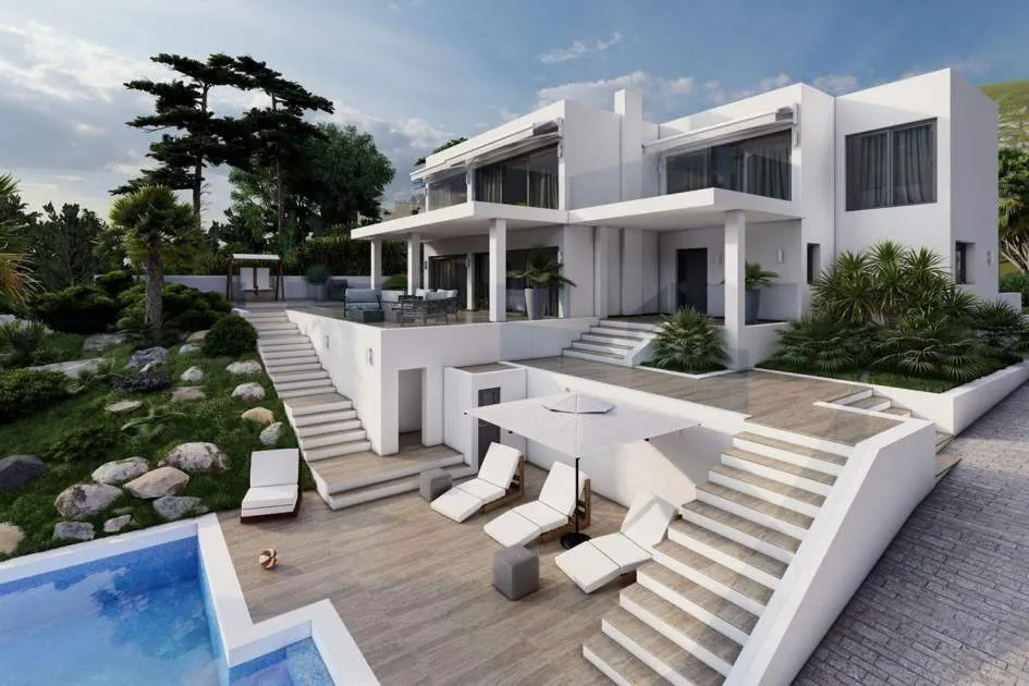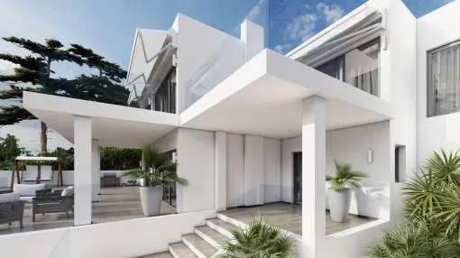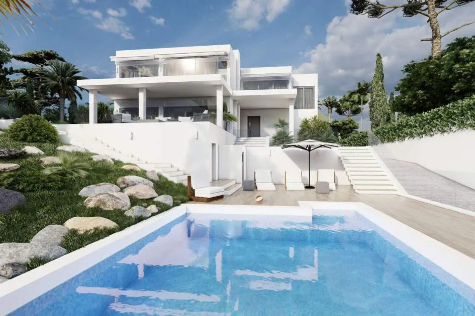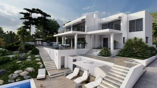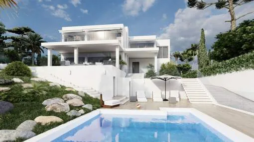 Este impresionante proyecto se realizará en una demandada zona residencial cerca del centro de Santa Ponsa al final de una calle tranquila. Varias playas, campos de golf y puertos deportivos están en las inmediaciones o a un corto trayecto en coche. La planta de entrada a nivel de calle comprende un amplio salón-comedor con acceso a una terraza cubierta con maravillosas vistas panorámicas al mar, una lujosa cocina de marca con coladuria, un dormitorio con baño en suite y un aseo. La planta superior alberga el amplio dormitorio con vestidor, baño y una terraza con fantásticas vistas y otros dos dormitorios con baños y terrazas. La planta inferior cuenta con varios trasteros y salas técnicas. En el exterior hay acogedores porches y terrazas con piscina y un hermoso jardín con riego automático. La propiedad también incluye dos garajes dobles.
