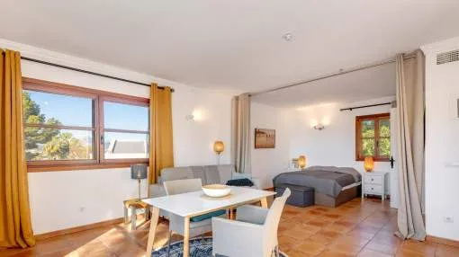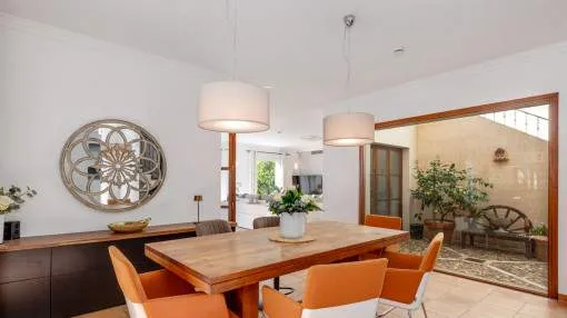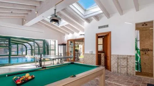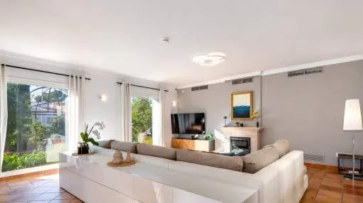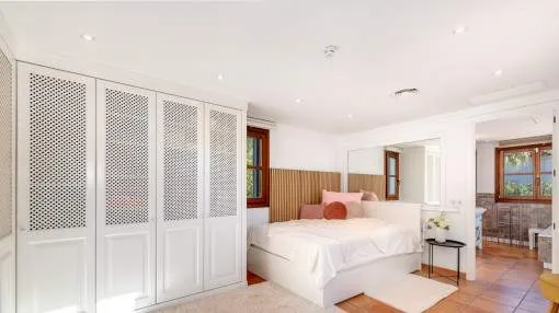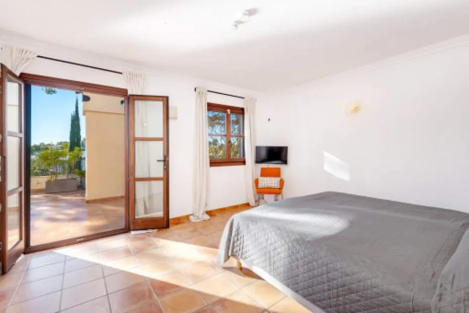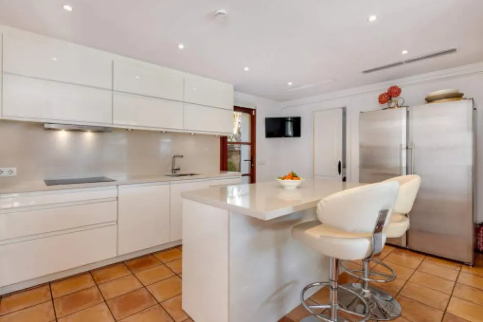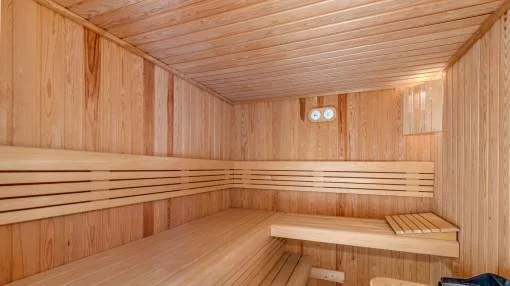 Descripción del inmueble: Esta preciosa villa de estilo rústico moderno se encuentra en un cuidado barrio de villas de Nova Santa Ponsa, una de las zonas residenciales más solicitadas del suroeste de Mallorca. A pocos minutos del puerto deportivo de Port Adriano, el centro de Santa Ponsa, 3 campos de golf y varias playas, la ubicación combina tranquilidad, sol y un estilo de vida mediterráneo con mucha privacidad. La casa fue diseñada con un enfoque en la comodidad y el estilo mediterráneo y ofrece 5 dormitorios y 5 baños en 501 metros cuadrados. El amplio salón-comedor con vigas de madera a la vista y chimenea constituye la pieza central de la casa. Una moderna cocina con lavadero independiente completa el bien pensado concepto de las habitaciones. Destaca especialmente la piscina interior/exterior climatizada con techo corredizo de cristal, zona de bienestar contigua con gimnasio, sauna, baño de vapor y ducha, ideal para relajarse. El cuidado jardín, con terrazas cubiertas y descubiertas, crea un verdadero oasis de bienestar en un ambiente mediterráneo. Otro punto a destacar es el amplio apartamento de invitados con acceso independiente, que ofrece un espacio habitable bien pensado y un alto nivel de confort. Dispone de una cocina totalmente equipada, un amplio dormitorio y un generoso cuarto de baño - ideal para la familia, los amigos o incluso el personal, ya que combina lujo, privacidad e independencia. Las características incluyen calefacción por suelo radiante, aire acondicionado frío/calor, ventanas de doble acristalamiento, chimenea, aseo de invitados, dos garajes y calefacción de gasoil con bomba de calor integrada. Esta villa mediterránea combina lujo, confort, privacidad y familiaridad: un hogar con calidad de vida y estilo al más alto nivel. Lugar & alrededores: A sólo 20 minutos de Palma, la capital de la isla, en el suroeste se ubica el pueblo de Santa Ponsa. El centro del pueblo se encuentra alrededor de una bahía larga y rodeada de acantilados. Separada por una calle costera se encuentra una gran cantidad de restaurantes, bares y tiendas a lo largo de la zona de la playa. La bonita playa de arena está orientada al oeste, por lo que se puede disfrutar del sol hasta las últimas horas de la tarde. Durante todo el año, Santa Ponsa ofrece una buena infraestructura y es ideal para largas caminatas, excursiones en barco, rutas de ciclismo, nadar y jugar al tenis o al golf. El pueblo ofrece además una gran variedad de restaurantes típicos e internacionales. En el primer partido del complejo de tenis inaugurado en el 2016 que irradia un ambiente de Wimbledon, participaron unos de los mejores en el ranking mundial. A pocos minutos del centro se encuentra el pintoresco puerto deportivo, el Club Náutico. Hoy en día, Santa Ponsa es conocida por su alto nivel de vida, pero también es de importancia histórica: cerca del pueblo, en el Puig de Sa Morisca, desde la antigüedad hasta la época musulmana se encontró una colonización de la cultura Talaiot. Un poco más tarde, en el siglo XIII, Santa Ponsa fue el escenario para unos de los eventos más importantes para Mallorca: en septiembre de 1229 aquí llegó el rey Jaume I de Aragón con su ejercito y comenzó la reconquista de la isla de los moros. Para conmemorarlo se erigió una cruz de piedra en este lugar. Cada año en la primera semana de septiembre y en memoria de este evento, la “Fiesta Rei en Jaume” se lleva a cabo. Culmina con la representación de la batalla y un desfile. Fuera del centro del pueblo y situado entre 3 campos de golf y Port Adriano se encuentra Nova Santa Ponsa – una de las zonas residenciales más exclusivas de la isla. Aquí podrá disfrutar de la vida mediterránea, encontrarse con celebridades y jugar al golf. Exclusivas residencias junto al golf, pisos preciosos en complejos bien cuidados y lujosos chalets de ensueño han atraído a acaudalados turistas y residentes de muchos países diferentes. Una punto a destacar es el nuevo y muy exclusivo puerto deportivo de Port Adriano diseñado por el arquitecto francés Philippe Starck que es uno de los puertos más modernos del mediterráneo. Aquí pueden atracar barcos de motor y de vela con una longitud de hasta 90 metros. El puerto con su muelle de dos alturas tiene un diseño moderno y ofrece una buena selección de tiendas y restaurantes y hasta brókers náuticos – aquí se encuentra un poco de todo. En la planta superior y al final del muelle, el bar „Sansibar“ conocido de la isla de Sylt se ha asegurado probablemente el mejor lugar. En un ambiente moderno se puede disfrutar de las bonitas vistas y del sol o tomar un cóctel por la noche al gozar del ambiente del puerto.