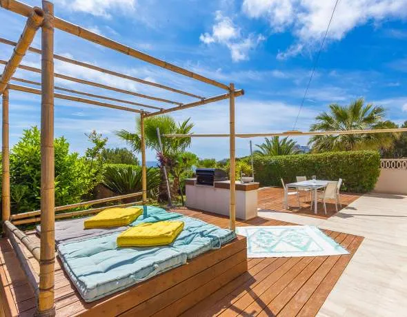 Este luminoso apartamento se encuentra en una exclusiva urbanización a tan sólo 20 kilómetros de Palma y forma parte de un pequeño complejo con ocho viviendas. Dispone de una bonita zona comunitaria con piscina y solárium, así como plazas de aparcamiento. La ubicación en 2ª línea de mar ofrece mucha tranquilidad y zonas verdes. No muy lejos se encuentra la encantadora playa de Cala Vinyas y en dos balnearios cercanos hay grandes playas de arena y una buena infraestructura. El apartamento con orientación sureste fue completamente renovado en 2019 y dotado con acabados modernos. La superficie habitable se divide en un salón-comedor, una cocina totalmente equipada, tres dormitorios y dos baños, uno de ellos en suite. Una terraza cubierta grande se integró en el salón-comedor a ahora se puede abrir completamente hacía la zona exterior mediante elementos de cristal. La amplia terraza con barbacoa, lounge y toldo tiene vistas al mar.