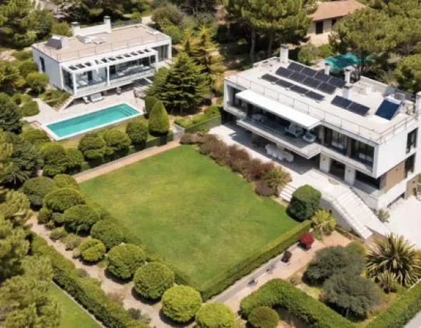 Set on a 1,554 sqm plot with 612 sqm of built space, the main villa offers 5 bedrooms, 4 bathrooms, and a high-quality fitted kitchen with Siemens appliances. Underfloor heating with a heat pump, central air conditioning, and a stylish fireplace ensure year-round comfort. An absolute highlight is the completely separate guest house with 2 bedrooms, 2 bathrooms, its own pool, and a parking space – perfect for guests or rental, offering maximum privacy.