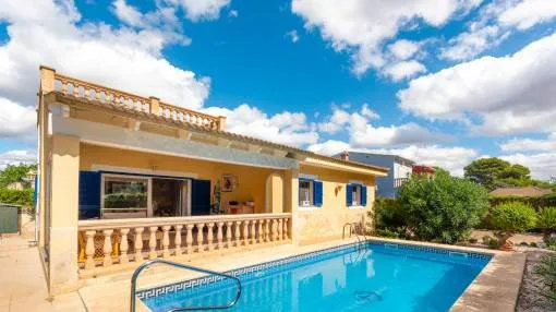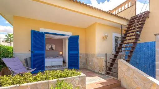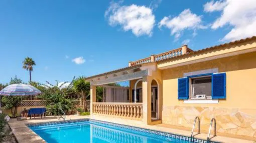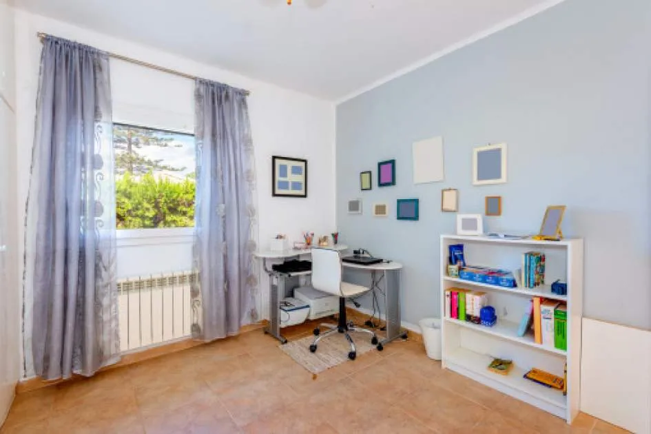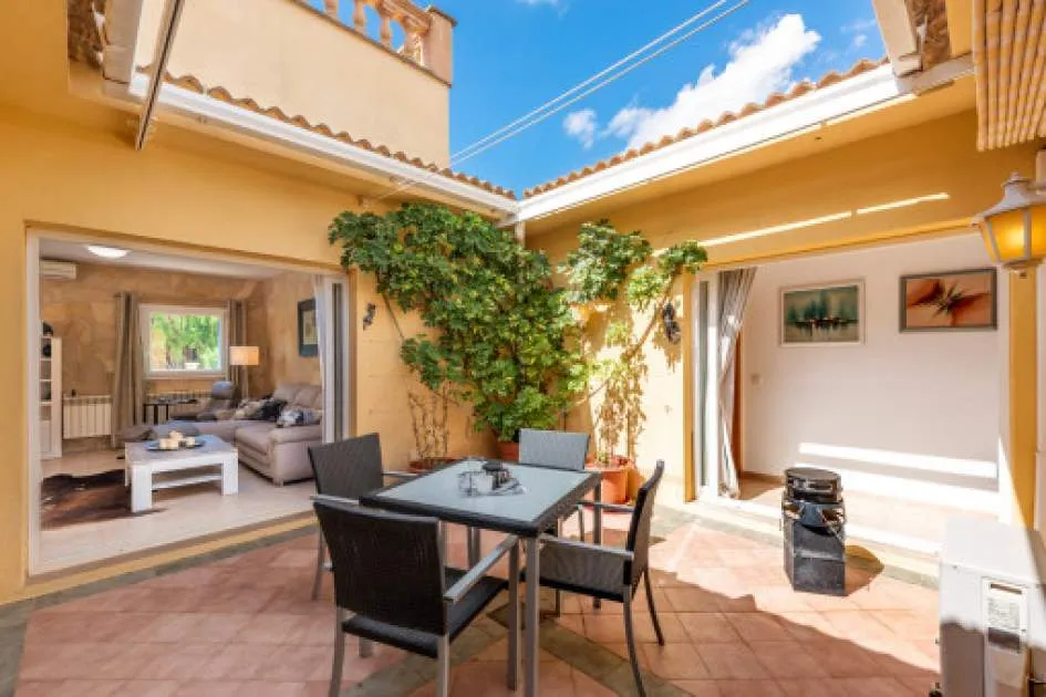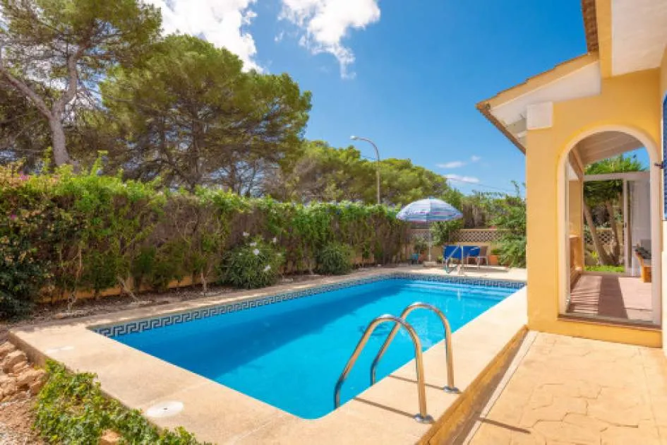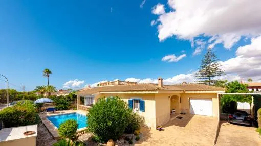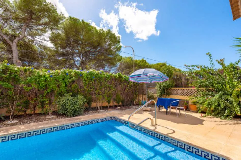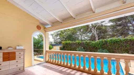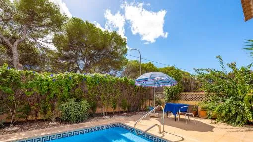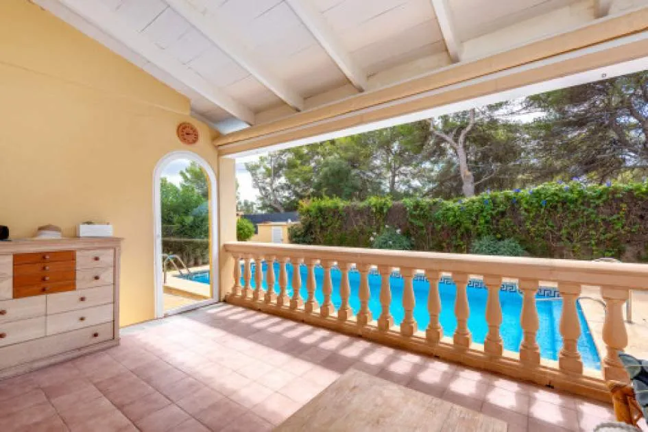 La zona exterior está concebida para el disfrute y la relajación: un porche cubierto, utilizable también en invierno, conduce directamente a la piscina privada de 8 x 4,5 metros, equipada con ducha exterior y terraza solárium. El cuidado jardín, con limoneros, plantas ornamentales y dos trasteros adicionales, refuerza el encanto mediterráneo de la propiedad. Además, dispone de carport para dos vehículos y la parcela se encuentra totalmente vallada.