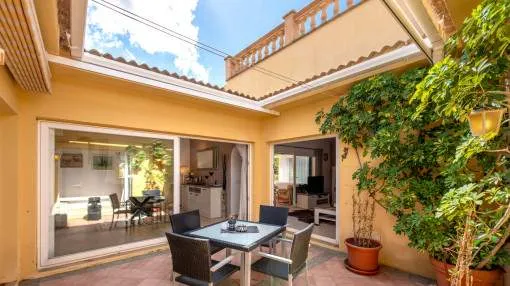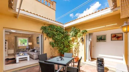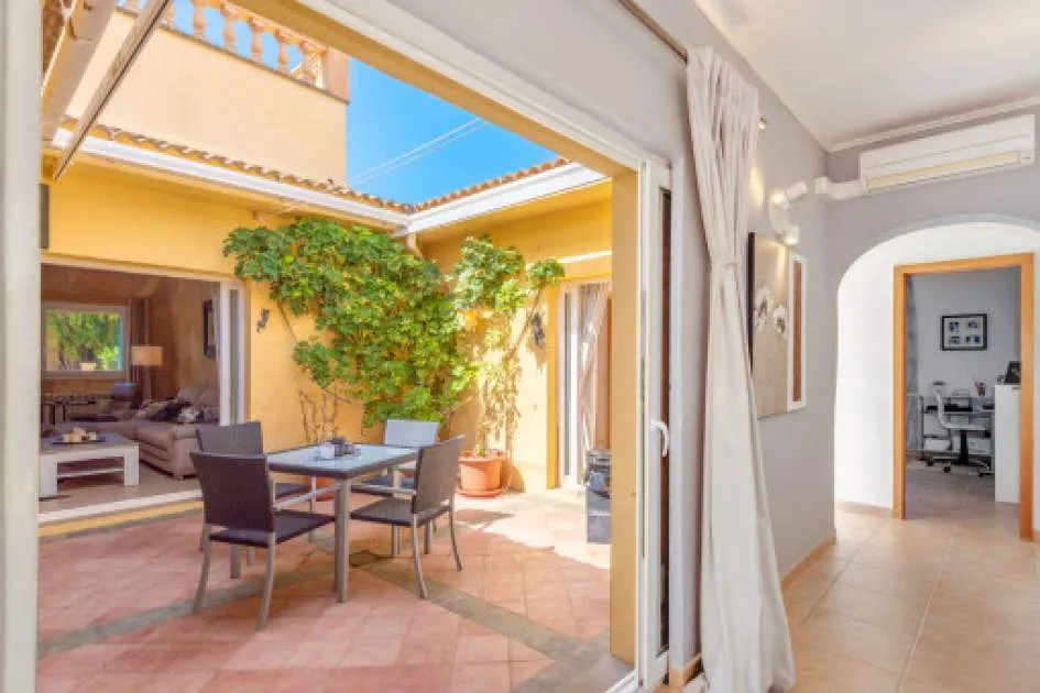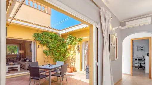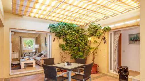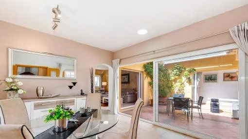 Un elemento singular es el amplio patio interior de 5 x 5 metros, con toldo retráctil y puertas de PVC con doble acristalamiento hechas a medida. Todas las puertas pueden recogerse completamente dentro de la pared, lo que garantiza una ventilación óptima y, al mismo tiempo, absoluta privacidad.