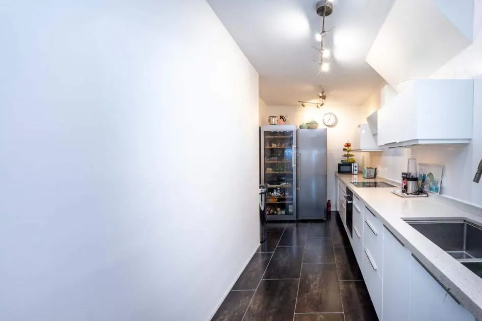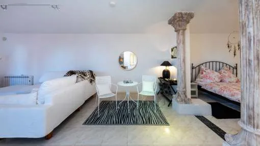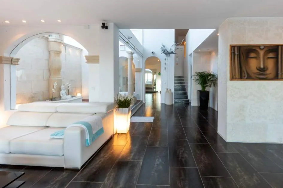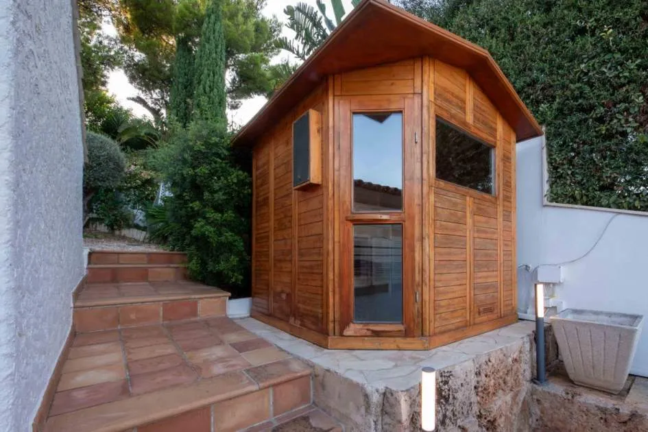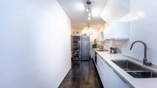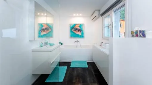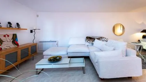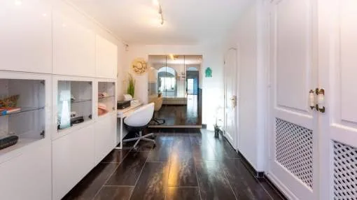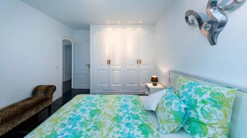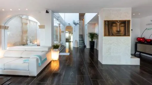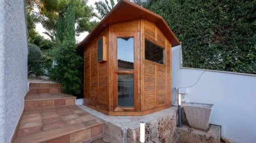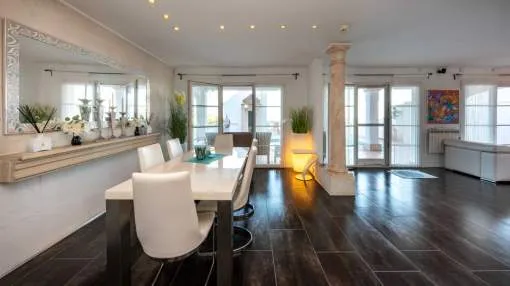 Las amplias terrazas ofrecen unas vistas panorámicas incomparables sobre la Bahía de Palma y las montañas. La zona exterior con piscina, sauna, jacuzzi y generosas zonas de estar y descanso crea un ambiente que recuerda a un espacio privado, ideal para relajarse y disfrutar. Un ascensor conecta cómodamente las plantas, complementado por un amplio garaje para hasta 4 vehículos y trasteros.