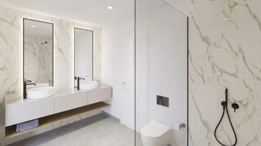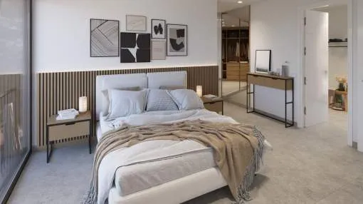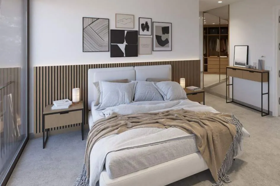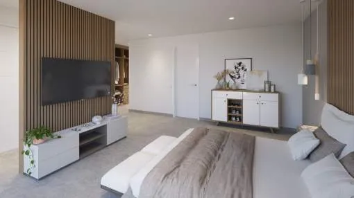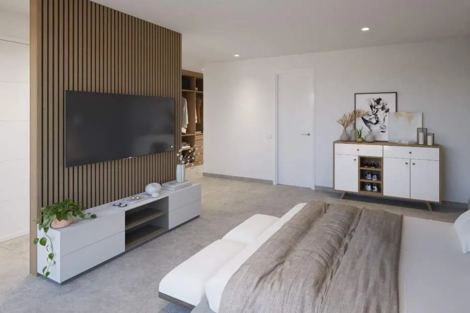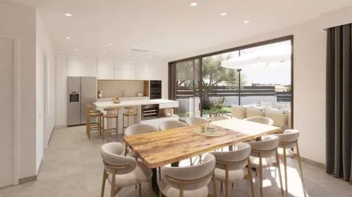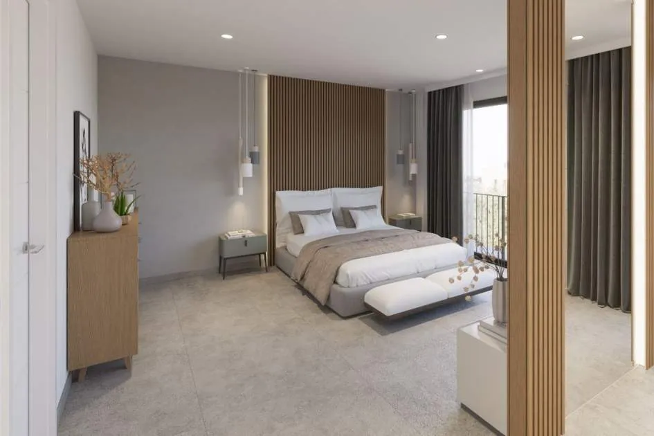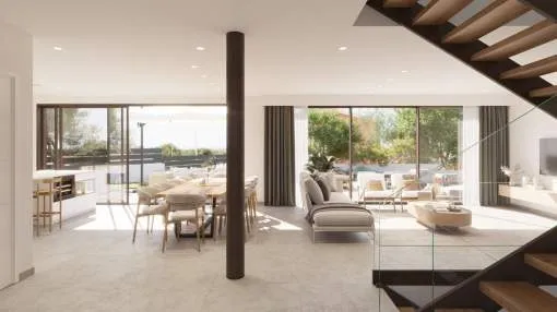 La planta baja cuenta con un gran salón-comedor con cocina abierta totalmente equipada, un dormitorio en suite y un aseo de cortesía. En la planta superior se encuentran tres dormitorios, todos con vestidor y baño privado, además de una terraza en la azotea con vistas a la Bahía de Palma y la Serra de Tramuntana.