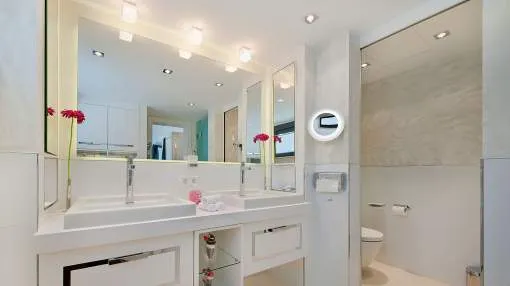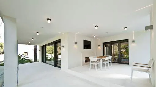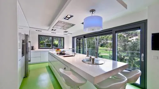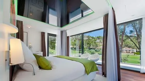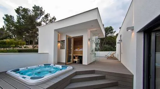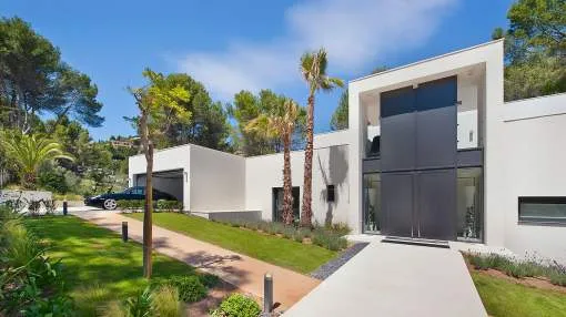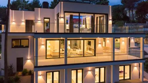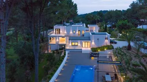 Ubicada en una de las zonas residenciales más exclusivas de Mallorca, justo al lado del prestigioso campo de golf Son Vida, esta moderna villa de lujo se encuentra en una parcela de aproximadamente 2.000 m² y ofrece mucha privacidad. Tiene todo confort de vida contemporáneo, acabados elegantes y una tecnología doméstica de última generación.