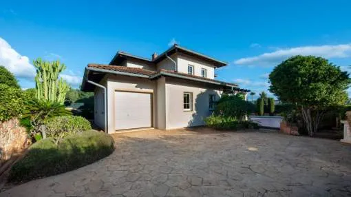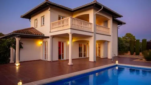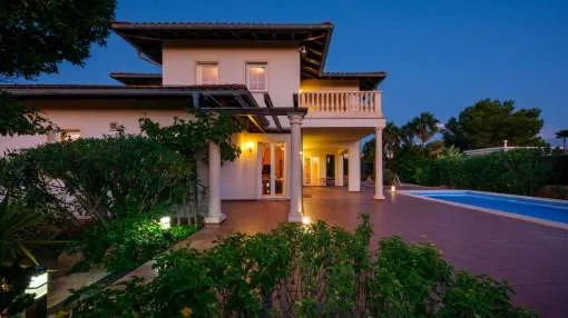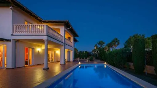 El área exterior cuenta con una gran terraza con piscina y jardines mediterráneos bien cuidados, invitando a relajarse y disfrutar con familiares y amigos.
