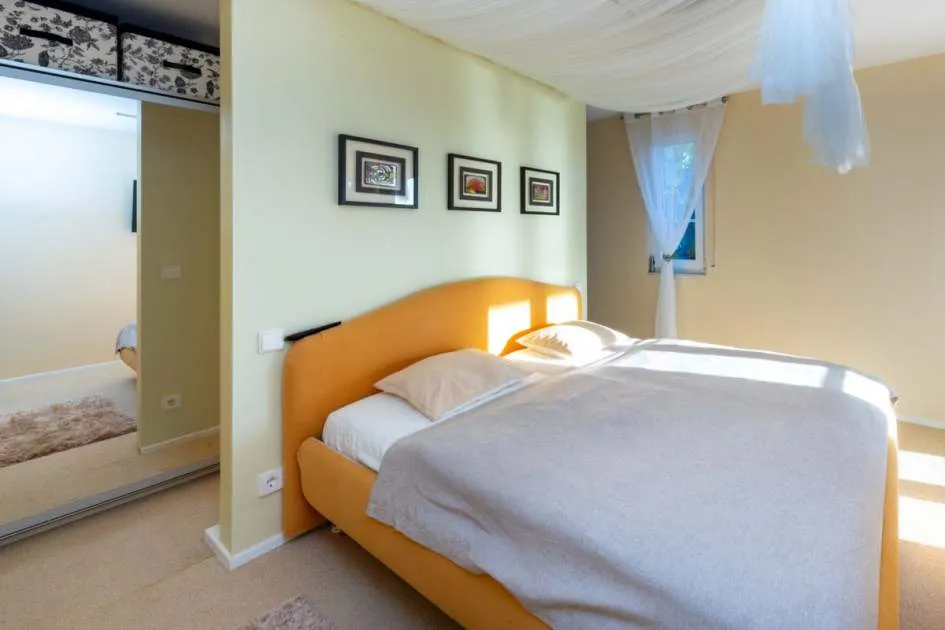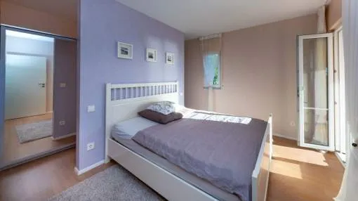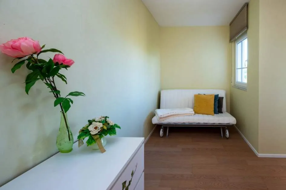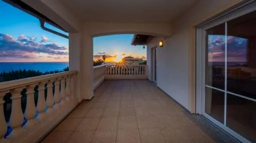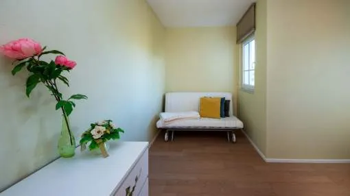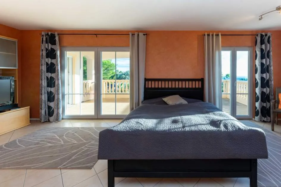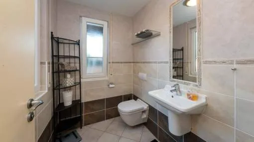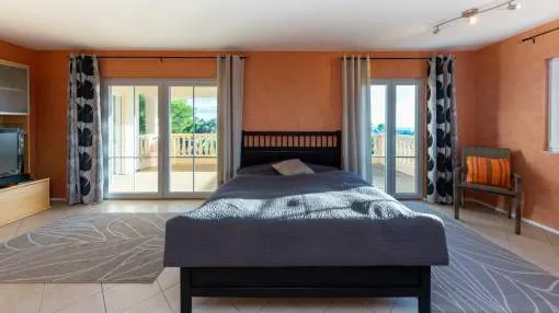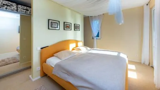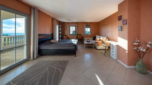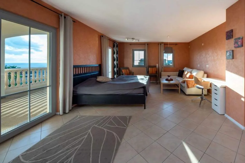 Una escalera de madera conduce a la planta superior, que incluye dos dormitorios adicionales y un baño. Un amplio y luminoso salón da acceso a una gran terraza con vistas al mar – esta zona también puede utilizarse como un apartamento independiente, ideal para invitados o estancias prolongadas.