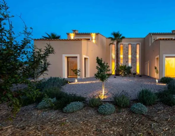 Exclusiva villa de obra nueva en Sencelles, situada en la tranquila zona rural de Els Jornets, con vistas panorámicas a la Serra de Tramuntana. Construida bajo una licencia anterior a la normativa vigente, permite una generosa superficie de 492 m² construidos y una espectacular piscina de 83 m², todo sobre una amplia parcela llana y fértil.
