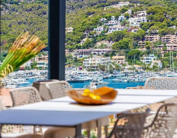 Esta moderna villa de nueva construcción, recientemente terminada, impresiona por su ubicación sobre el pintoresco Port d’Andratx, así como por sus fantásticas vistas panorámicas al puerto y su excelente calidad de construcción. La propiedad con orientación suroeste se construyó en una parcela elevada en una ubicación residencial privilegiada, directamente adyacente a una zona verde. El popular paseo marítimo con sus numerosos cafés, restaurantes y boutiques se alcanza a pie en pocos minutos. La villa se extiende sobre cuatro plantas, que están conectadas por un ascensor y tiene su entrada principal en la planta baja. Lo más destacado de la villa es la terraza de la azotea con suelo de teca, piscina infinita, salón de verano, jacuzzi, terrazas cubiertas y descubiertas y un gran jardín. El equipamiento técnico con un moderno sistema de control doméstico KNX, una bomba de calor con apoyo solar para agua caliente y calefacción o refrigeración, así como calefacción de la piscina, grifería termostática en los baños y mucho más cumple con los más altos estándares. La villa fue amueblada y decorada por Espacio Home Design y con objetos de la Galería HMH.