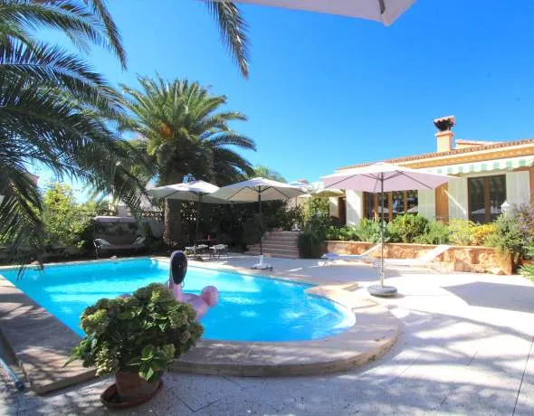 Esta encantadora villa de estilo mediterráneo se encuentra en una de las tranquilas zonas residenciales de Badia Blava. Enclavada en una parcela con absoluta privacidad, se despliega un jardín diseñado con mimo, que crea un ambiente muy especial con sus plantas mediterráneas. Palmeras, plantas en flor y terrazas bañadas por el sol crean un oasis verde que invita a quedarse, disfrutar y relajarse.